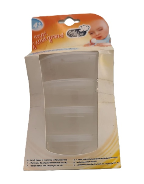 Set de 4 fiambreras o contenedores de congelación medianos. Capacidad: 100 ml por contenedor. Compatibilidad: Aptos para uso en microondas y congelador.