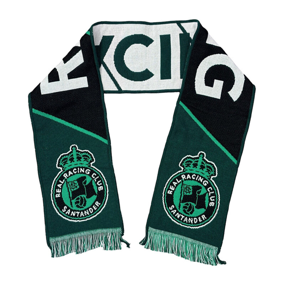 Bufanda con flecos tricolor en tela acrílica de alta calidad. Leyenda RACING en color blanco sobre dos áreas de color negro y verde segmentadas en diagonal . Emblema del Real Racing Club de Santander en ambos extremos sobre el fondo de color verde.