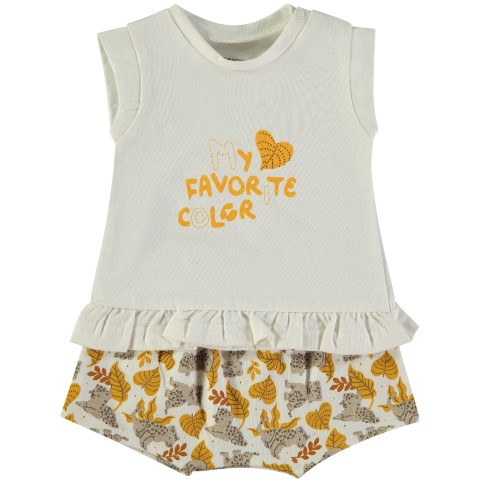 Conjunto para bebé de algodón compuesto por camiseta sin mangas con volante en parte inferior y pantaloncillo estampado. 100 % algodon organico