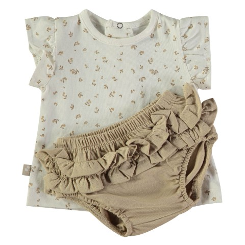 Camiseta con estampado y volantes en los hombros. Se combina con una braguita cubrepañal a juego para completar el conjunto.