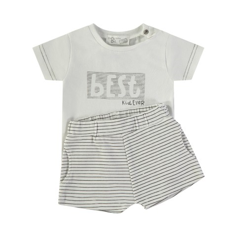 Conjunto de pantalón corto y camiseta de Babybol pensado para un look cómodo y veraniego. La camiseta blanca de manga corta se abrocha con cierre a presión en el hombro para facilitar la puesta y presenta un diseño estampado en el centro del delantero. El pantalón corto a juego, en blanco con rayas, incorpora cintura elástica para un ajuste cómodo y bolsillos laterales prácticos.