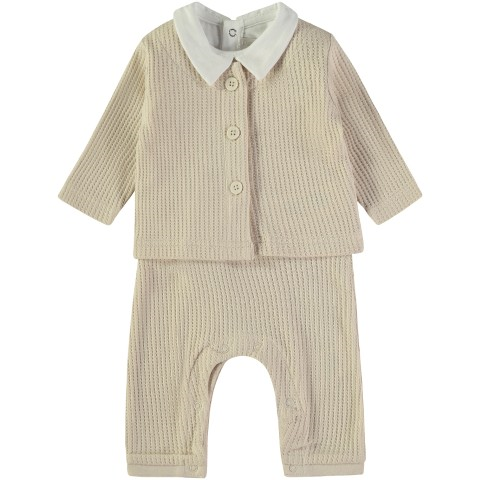 Conjunto de tres piezas Peto y chaqueta color beige, polo blanco de manga corta.