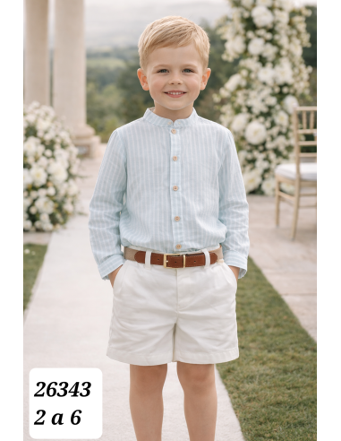 Conjunto infantil elegante y fresco perfecto para ocasiones especiales, celebraciones o eventos de verano. La camisa de manga larga en tejido ligero presenta un delicado diseño de rayas en tono suave y cuello mao con botones de madera que aportan un toque natural y sofisticado. Se combina con pantalón corto en color claro de corte clásico y cómodo, acompañado de cinturón que realza el look y le da un acabado muy cuidado.