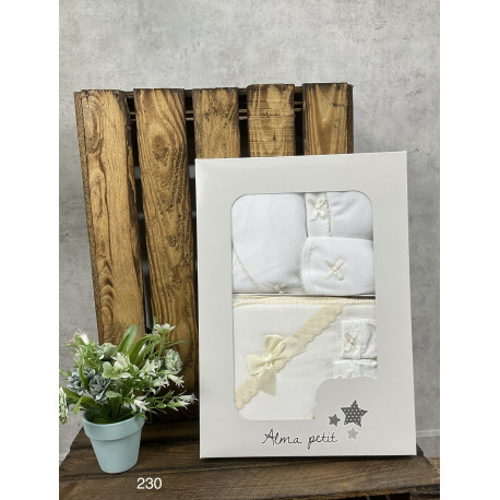 Conjunto completo de 5 piezas en algodón suave, pensado especialmente para los primeros días del recién nacido. Un set muy versátil y coordinado, ideal para regalo, bordado personalizado y para llevar en la maleta de hospital.