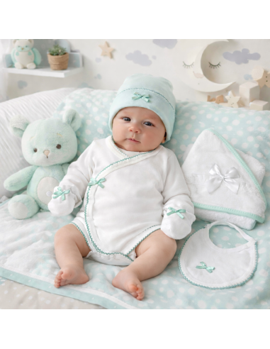 Conjunto completo de 5 piezas en algodón suave, pensado especialmente para los primeros días del recién nacido. Un set muy versátil y coordinado, ideal para regalo, bordado personalizado y para llevar en la maleta de hospital.