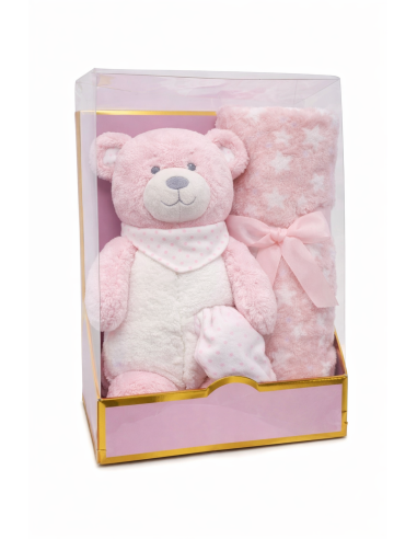 Set de regalo compuesto por manta suave y peluche a juego, presentado en caja transparente decorativa, ideal para nacimientos, canastillas y regalos de bebé. La manta destaca por su tacto extrasuave y cálido, perfecta para el uso diario en cuna, cochecito o capazo. El peluche, de diseño tierno y colores coordinados, es agradable al tacto y seguro para el bebé, pensado tanto para el juego como para el descanso.
