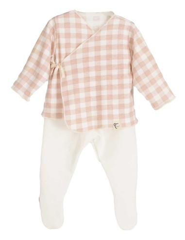 Estuche premium para recién nacido compuesto por conjunto de polaina cruzado, gorro y manoplas a juego en delicado tejido de algodón suave con estampado cuadro vichy en tonos pastel. La camiseta de cruce lateral con lazada facilita el cambio y aporta máxima comodidad. La polaina mantiene al bebé abrigado sin oprimir, mientras que el gorro y las manoplas completan el look y protegen piel y cabecita.