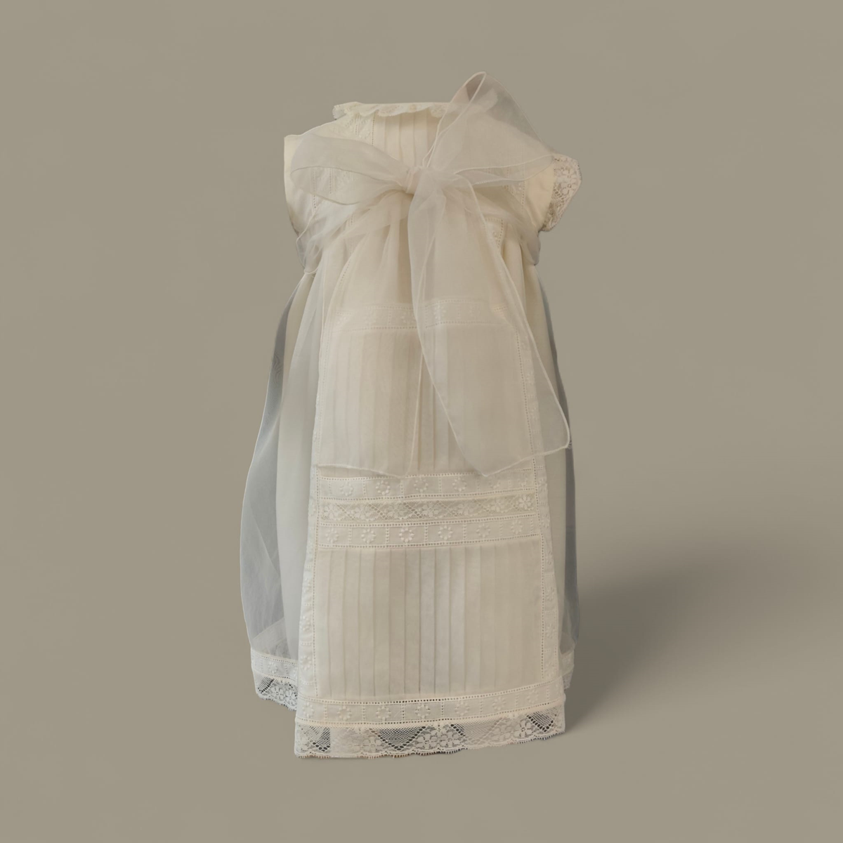 Faldón de Bautizo o ceremonia en color crema con forro. Con lazada en el pecho y puntillas tipo vallencie Disponible en talla única 12/18 meses