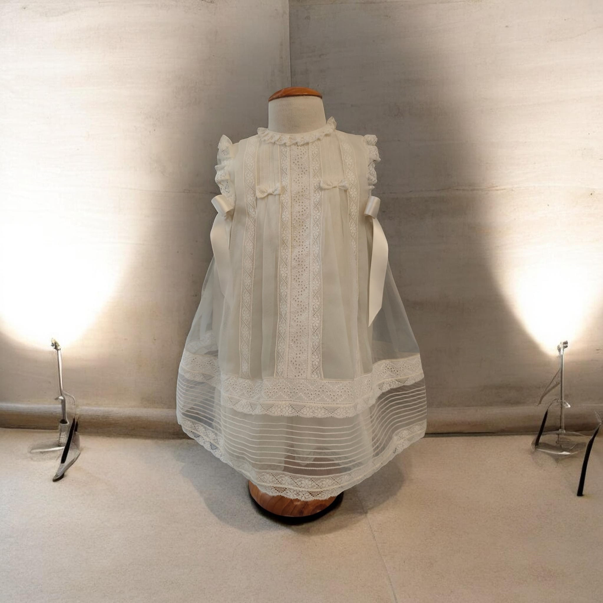 Faldón de Bautizo o ceremonia en color crema con forro. Con lazos en los costados y puntillas tipo vallencie Disponible en talla única 6/12 meses