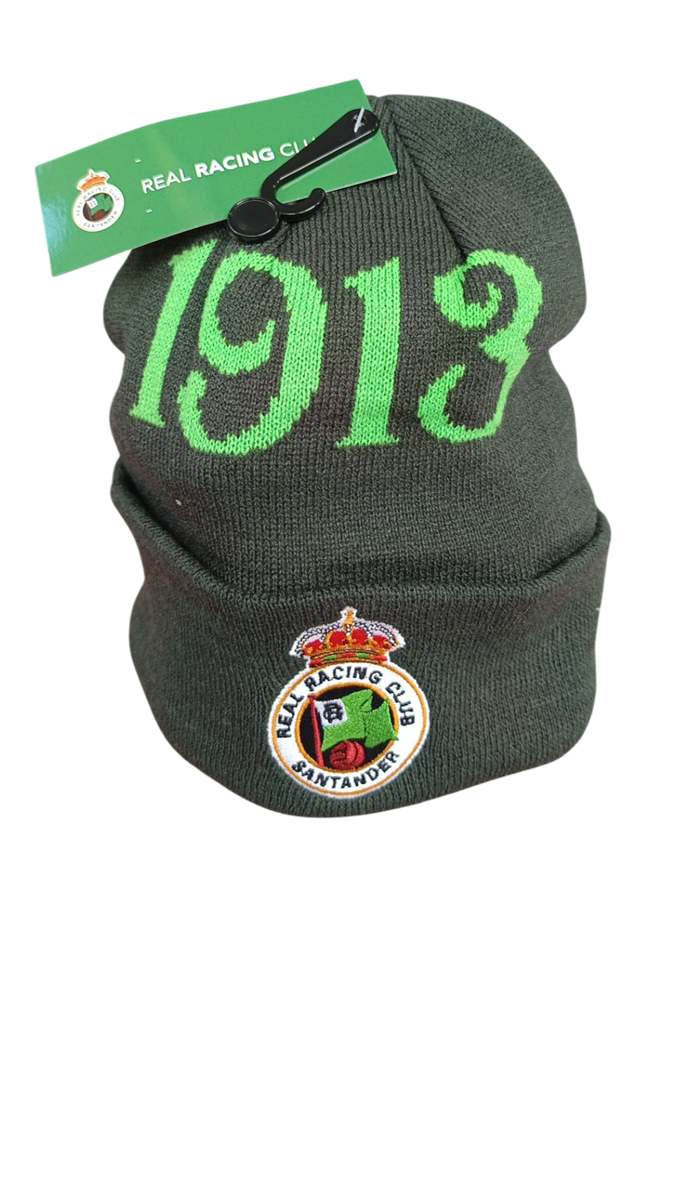 Gorro clásico con el año 1913 escrito en verde claro, elaborado en lána de alta calidad. Escudo bicolor del Real Racing Club de Santander bordado en banda frontal de color verde oscuro. TALLA ADULTO
