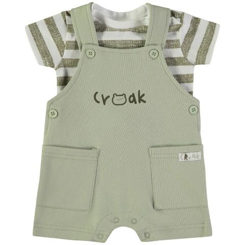 Conjunto de dos piezas para bebé compuesto por camiseta y peto corto. La camiseta es de rayas en color verde y blanco, con manga corta y cuello redondo. El peto está confeccionado en tejido de algodón en color verde caqui, con bolsillos laterales y estampado en el frontal.