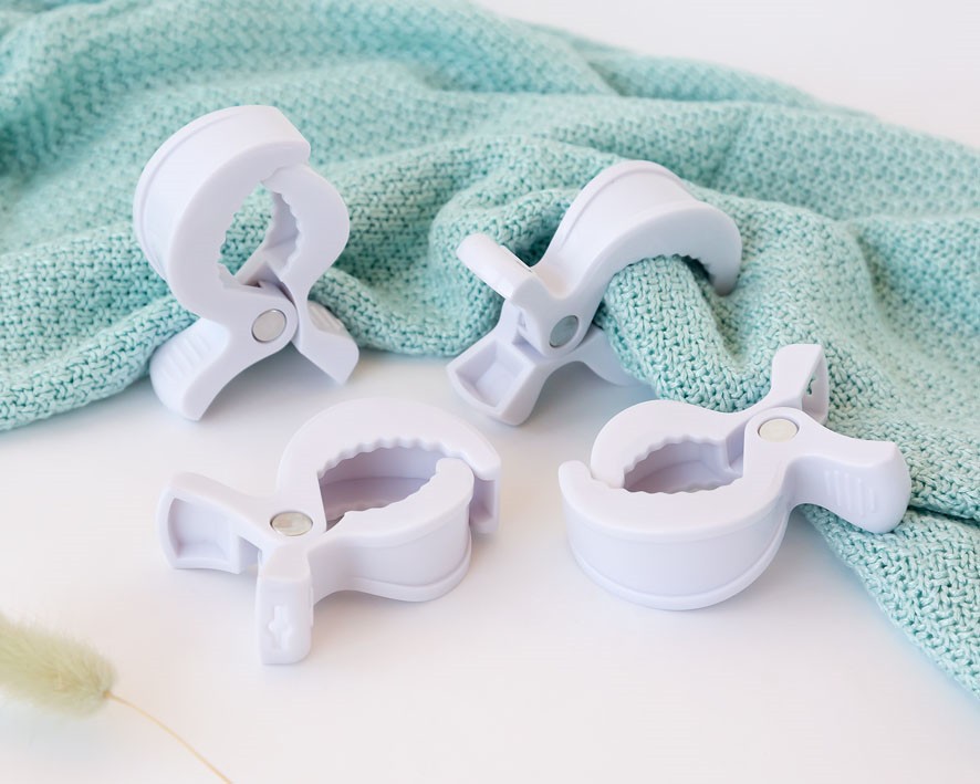 Con estas prácticas pinzas podrás sujetar perfectamente la muselina de tu bebé a tu carrito, la cuna o la silleta. Tu bebé irá descansando y protegido con su muselina en el carrito.
