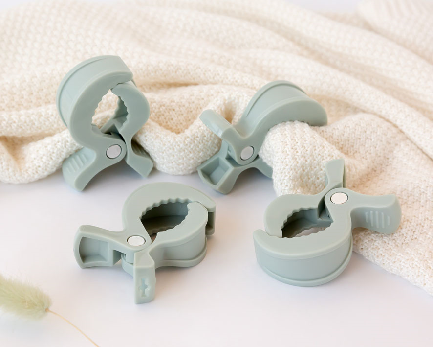 Con estas prácticas pinzas podrás sujetar perfectamente la muselina de tu bebé a tu carrito, la cuna o la silleta. Tu bebé irá descansando y protegido con su muselina en el carrito.