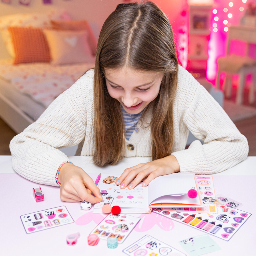 Panda power! Esta monada de diario solo necesita ser rellenado con pensamientos secretos y sueños. Se incluyen: 4 rollos y portarrollos de cinta adhesiva decorada, 3 clips grandes con pompones de colores, 1 lápiz rosa rematado con un panda como topper, además de muchísimas pegatinas para embellecer las páginas. Destaca especialmente la figura de la carita de un panda haciendo de guardián en la portada. Se incluye un pequeño folleto con ideas creativas explicadas con claridad.