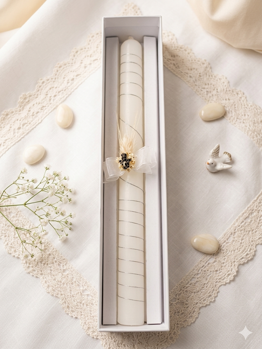 Vela para la ceremonia. Con detalle de angelito, espiga y lazo. Guárdala después para la 1ª comunión. Medias alto 30 cm Diámetro 2,5 cm.