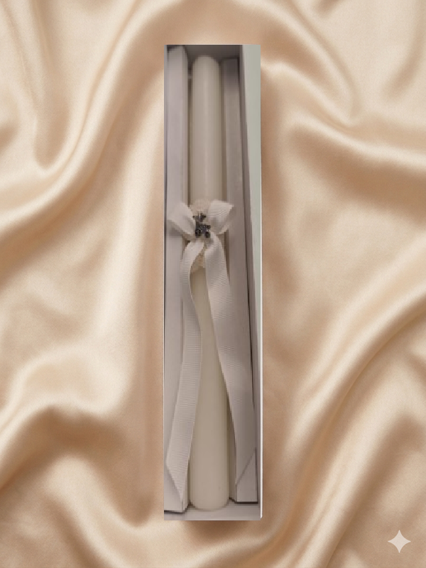 Vela para la ceremonia. Con detalle de conchecito y lazo. Guárdala después para la 1ª comunión. Medias alto 30 cm Diámetro 2,5 cm.