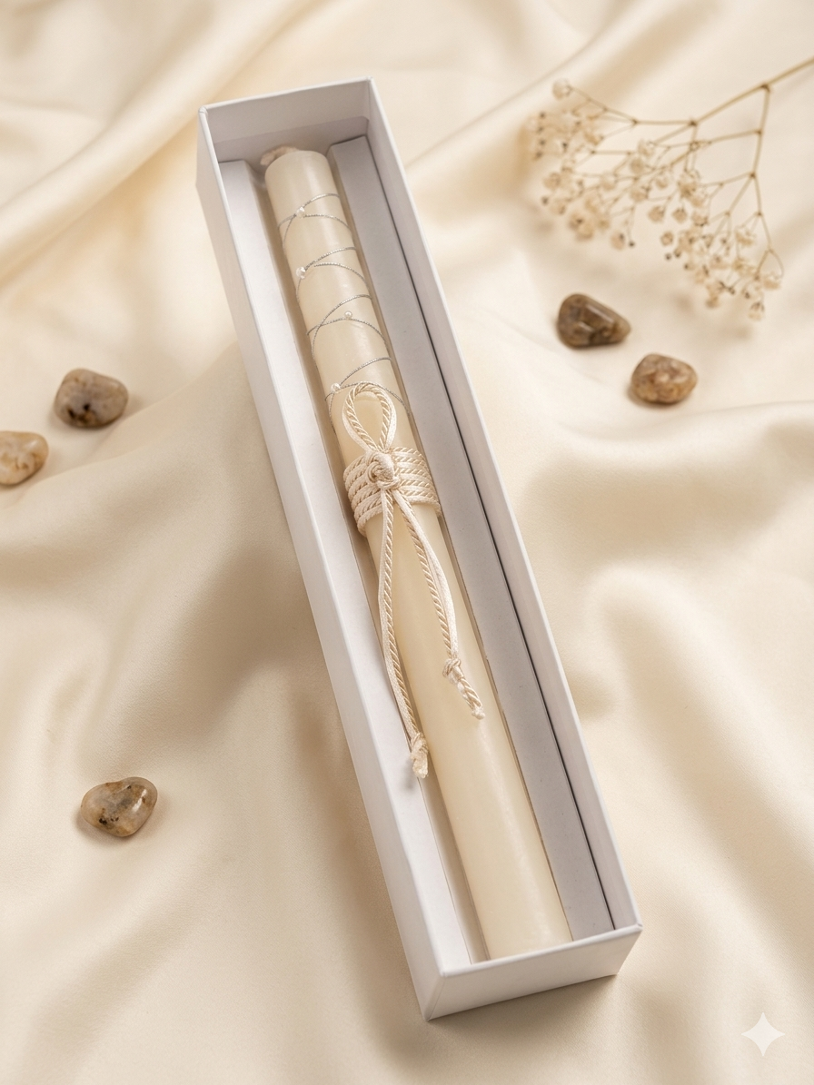 Vela para la ceremonia. Con detalle de cordón y perlitas. Guárdala después para la 1ª comunión. Medias alto 30 cm Diámetro 2,5 cm.