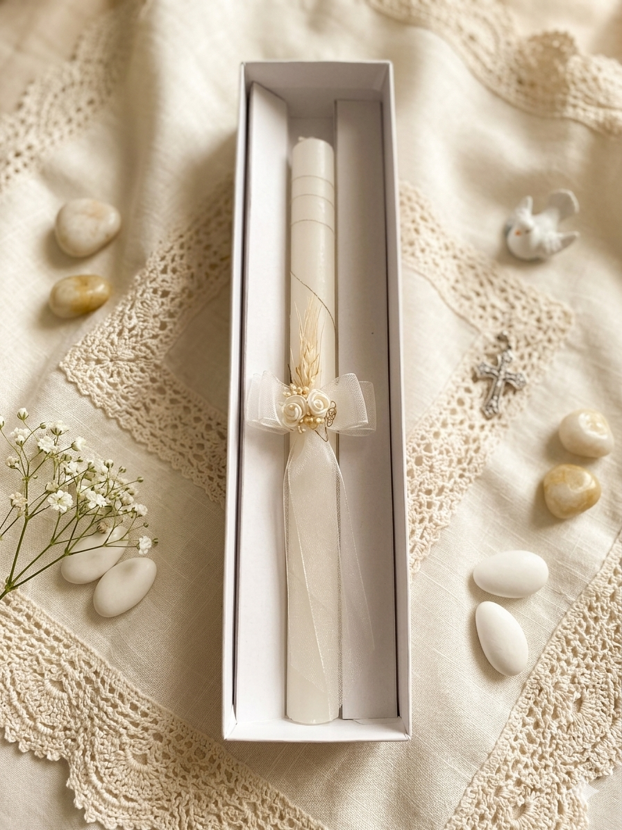 Vela para la ceremonia. Con detalle de flores, espiga y lazo. Guárdala después para la 1ª comunión. Medias alto 30 cm Diámetro 2,5 cm.