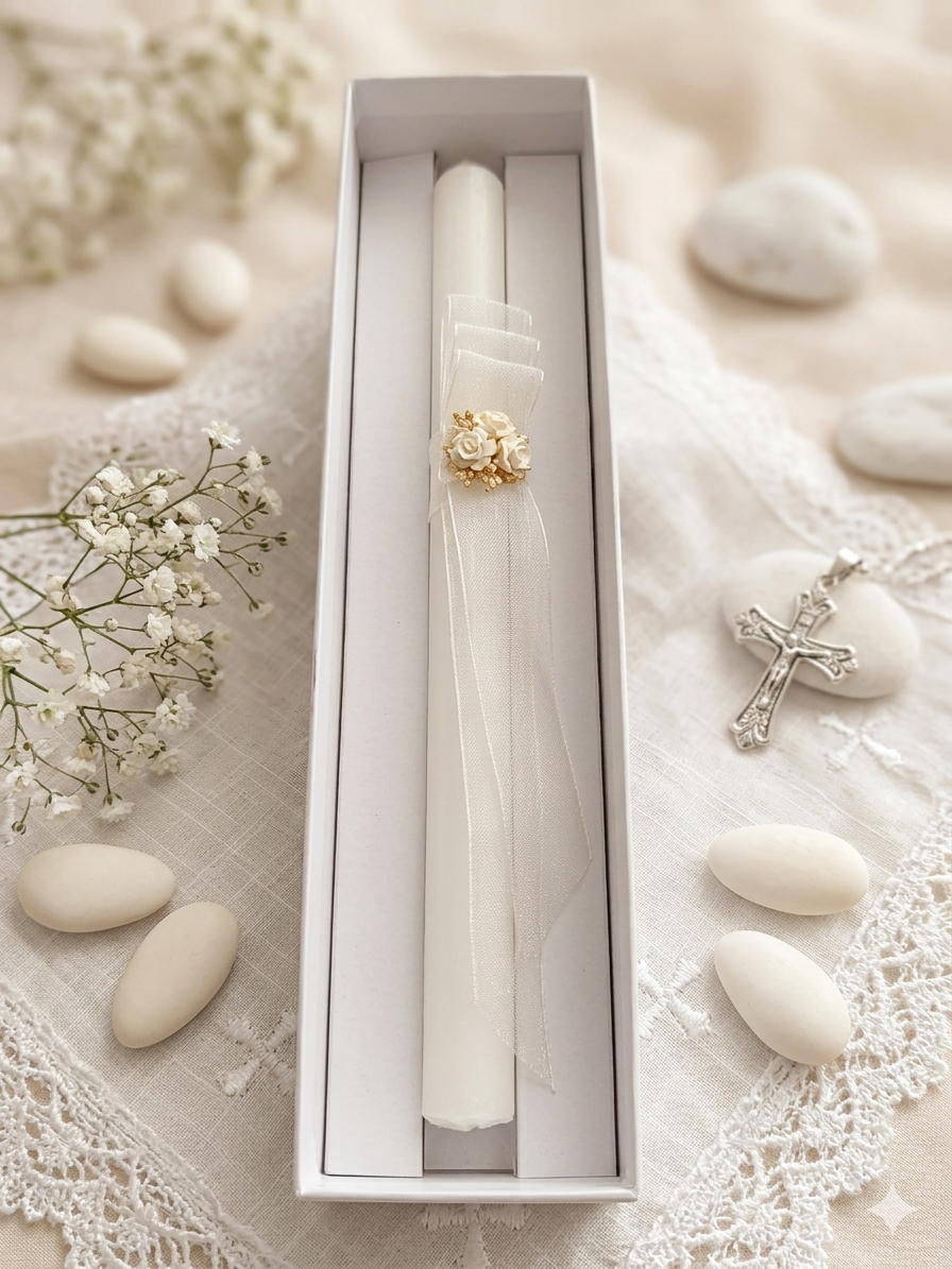 Vela para la ceremonia. Con detalle de flor y lazo. Guárdala después para la 1ª comunión. Medias alto 30 cm Diámetro 2,5 cm.