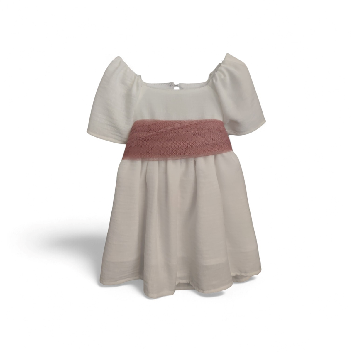 Vestido para niña con forro en color blanco roto, manga amplia y espalda abierta con fajín tul color rosa. ideal para bodas y eventos
