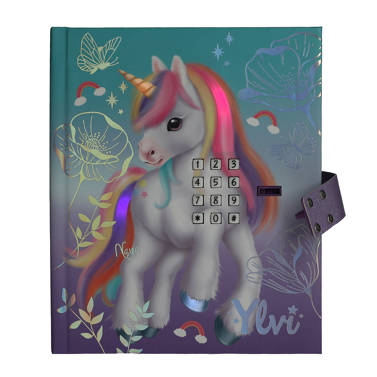 Un lugar seguro para pensamientos mágicos. El diario de unicornio de Ylvi and the Minimoomis solo se puede abrir si se introduce correctamente el código secreto (se elige libremente y se puede cambiar tantas veces como se desee). Al activar la apertura suena una melodía mágica y en la portada se iluminan lucecitas. Tiene 192 páginas rayadas e ilustraciones monísimas.